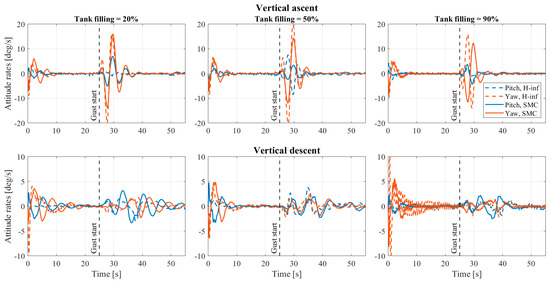 Figure 15 provides a comparison between the SMC (solid lines) and the “old” structured H-Infinity controller designed without aerodynamics in the plant (dashed lines) for a tank filling of 50%. The figure depicts the worst-case pitch rates (blue lines) and yaw rates (red lines) for the ascent trajectory on the left-hand side and for descent on the right-hand side. For a fair comparison, the knowledge of the aerodynamics of the SMC was removed in these results by not considering the aerodynamic terms in the estimation of in Equation (43). It can be observed that the SMC shows a significantly better capability to reject the wind gust, especially during vertical ascent (left-hand side plot), with much lower angular rates and settling time than the structured H-Infinity controller. The poor behavior of the “old” H-Infinity controller was anticipated by the frequency domain analysis, where the worst-case stability margins were close to zero for the corresponding case (red lines in Figure 12). The good behavior of the SMC indicates that the error introduced by not considering the aerodynamic terms in the estimation of is successfully mitigated thanks to the bounding function in Equation (43). For vertical descent (right-hand side plot), the structured H-Infinity controller shows a much better disturbance rejection, being now comparable to the SMC. The improvement of the properties of the H-Infinity controller from ascent to descent flight was also anticipated by the frequency domain analysis (from the red to the light blue lines in Figure 12).