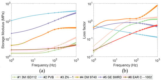 Frequency−dependent characteristics of six viscoelastic materials over the range from 1 Hz to 1000 Hz. (a) Storage modulus; (b) Loss factor.