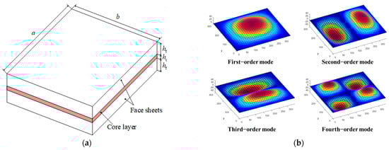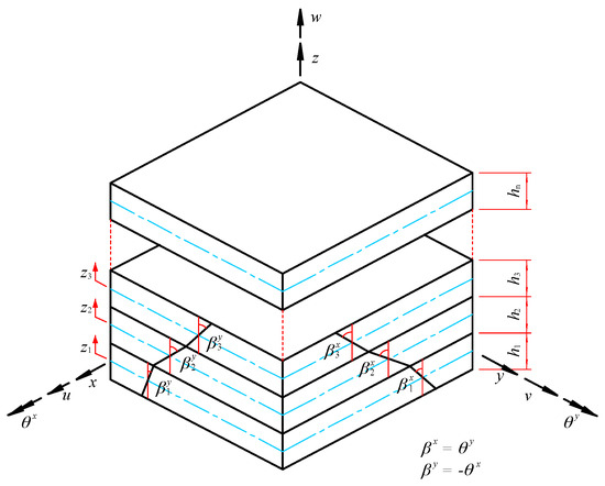 In this work, a well-validated LW finite element model, as proposed in Refs. [51,52], will be employed to model viscoelastic damped composite structures. Figure 2 presents the kinematic model of the n-layer viscoelastic damped composite structure. It is assumed that each layer follows the first-order shear deformation theory, with continuous displacements between layers. A global orthogonal coordinate system, o-xyz, is adopted, with the mid-plane of the first layer, o-xy, defined as the reference plane. The displacement of any given layer can be expressed as the sum of the displacement of the reference plane and a series of related coupled displacement terms, as shown in the equation below:
