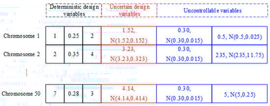 To enhance the robustness of both stiffness and damping performance, a comprehensive reevaluation of the type and thickness of the core layer material within the connecting plate, face plate, and base plate will be undertaken. The problem does not include deterministic design variables and uncontrollable parameters. The core types in the connecting plate, face plate, and base plate are the same and defined as the uncertain design variable . Considering four possible viscoelastic materials (#1, #3, #4, and #5), is encoded as integers 1, 2, 3, and 4, corresponding to different values of the random variable :