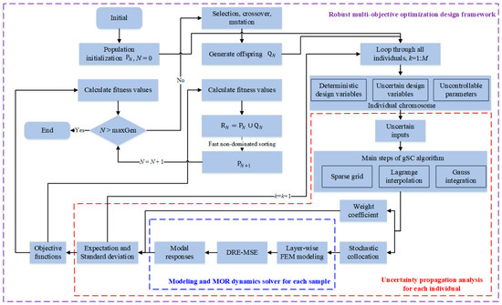 From the only available literature, it can be noted that the substantial computational cost related to the repeated uncertainty propagation (UP) analysis during optimization iterations poses a significant challenge for RDO in viscoelastic damped composite structures. UP is a forward quantitative procedure used to predict the impact of uncertainties on responses. Currently, most UP analyses in this field primarily utilize the Monte Carlo Simulation (MCS) method, as demonstrated by Hernández et al. [41], Druesne et al. [42], and Silva et al. [43]. While MCS is favored for its straightforward implementation and high accuracy, it requires numerous evaluations of a deterministic solver across various parameter realizations, making it computationally intensive and time-consuming. To overcome this issue, we previously employed a stochastic collocation (SC) method [44] for UP analysis of modal responses [45] and frequency responses [46,47]. This approach utilizes input statistical information for sampling and polynomial basis selection, enabling the construction of a high-fidelity probabilistic surrogate model at a low computational cost. Once established, the approximation model allows for UP analysis to be conducted with negligible expense.