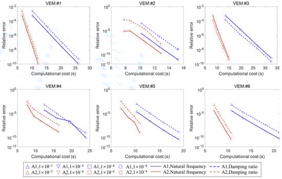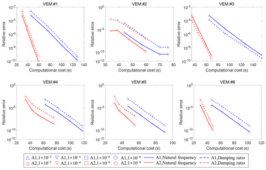 - Matrix assembly is a crucial step in the FEM process. To solve the nonlinear eigenvalue problem for the first modes, suppose that each mode requires iterations. This results in a total of eigenvalue solutions. For systems with a large number of DoFs, especially when the required number of modes is substantial, the related matrix assembly in the total iterative loop can be computationally expensive. A more efficient approach is to utilize a decomposition that separates from the stiffness matrix. Since the computational cost of calculating the scalar is negligible, this significantly reduces the expense of matrix assembly during the construction ofwhere is the stiffness matrix associated solely with elastic materials, and is the stiffness matrix related to viscoelastic materials, determined after introducing .