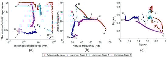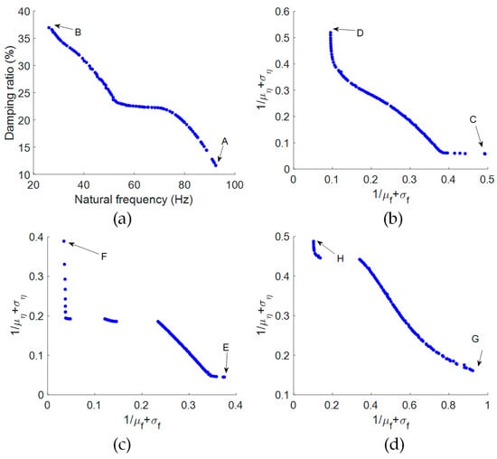 Subsequently, we identified the design solutions exhibiting either the best stiffness robustness or the best damping robustness from the results presented in Figure 17, which utilized different viscoelastic damping materials. These solutions are denoted by the labels A, B, C, D, E, F, G, and H, with the specific design variable parameters provided in Table 8.