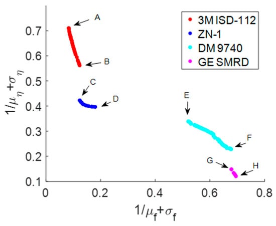 The algorithm parameter settings are as follows: In the DRE-MSE method, the error tolerance is established at 1 × 10−4. In the NSGA-II algorithm, the population size is set to 100, and the maximum number of evolutionary generations is defined as 50. Figure 17 presents the robust Pareto optimal results for the fundamental frequency and damping characteristics based on the selection of core layer material types and thicknesses of the three plate components. Specifically, the optimization outcomes incorporating various types of viscoelastic damping materials are distinguished by different colors. It is observed that all four types of viscoelastic damping materials appear in the optimal solution, displaying distinct clustering patterns. The red color denotes the optimization results featuring 3M ISD−112 viscoelastic material, which demonstrates excellent stiffness robustness but relatively poor damping robustness. This indicates low dispersion in the fundamental frequency while exhibiting significant dispersion in the fundamental damping characteristics. In contrast, the purple color represents the optimization results utilizing GE SMRD viscoelastic material, which shows outstanding damping robustness but significantly reduced stiffness robustness. Such a configuration is particularly appealing for design products that prioritize the dispersion of fundamental damping characteristics over frequency considerations. Additionally, both blue and cyan colors, representing the results with ZN-1 and DM 9740 viscoelastic damping materials, respectively, exhibit relatively superior robustness in both stiffness and damping, reflecting a more balanced design intent.
