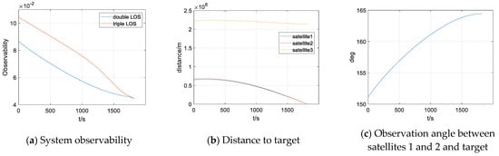System observability. (a) System observability. (b) Distance between tracking satellites and target. (c) Observation angle between satellites 1 and 2 and target.