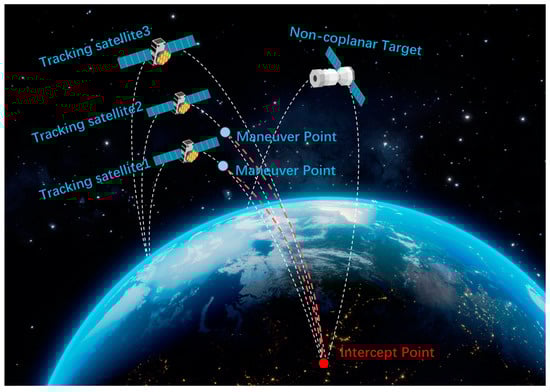 Compared to in-plane maneuvering, out-of-plane maneuvering requires more energy consumption, so maneuvers out of the orbital plane are avoided. And the intersection point is designed as the intersection between the non-cooperative target’s orbit and the orbital plane of the tracking satellites. The tracking satellites 1, 2, and 3 are on different parking orbits, with the same inclination and right ascension of the ascending node. At maneuver time, satellites 1 and 2 start transferring, while satellite 3 maintains its original orbit, and chasers 1 and 2 approach the intercept point to intercept the non-coplanar target, as illustrated in Figure 3. To optimize the configuration, the orbital altitudes of chasers 1 and 2 and the true anomaly when the maneuver begins are set as decision variables.