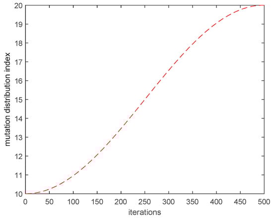 In the algorithm’s early stage, the mutation distribution index is minimized, so the offspring diverge more significantly from their parents. At the same time, the change in the mutation distribution index in the early stages is relatively slow, which allows the algorithm to explore the solution space more fully and escape from local optimal solutions in the early stage. In the middle stage, the index changes more rapidly, focusing the search around the optimal solution and accelerating convergence. In the later stage, the index changes slowly again, with a large mutation distribution index causing offspring to more closely resemble their parents, supporting refined local optimization around the optimal solution. This overall variation trend is illustrated in Figure 4.