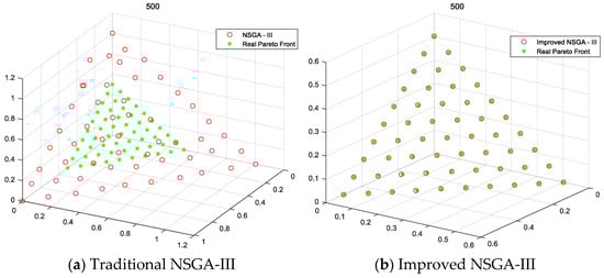 To evaluate the performance of the improved NSGA-III algorithm against the traditional NSGA-III algorithm, consistent algorithm parameters were set, and the standard multi-objective test function DTLZ1 [] was utilized for testing, as shown in Equation (18), where is the number of objectives, is the number of decision variables, and is set to 5. To ensure that the population was uniformly distributed across reference points, a population size of 56 was chosen with a maximum of 500 iterations. The traditional algorithm applied a mutation distribution index of 15, while the improved algorithm had maximum and minimum mutation distribution indices of 25 and 5, respectively.