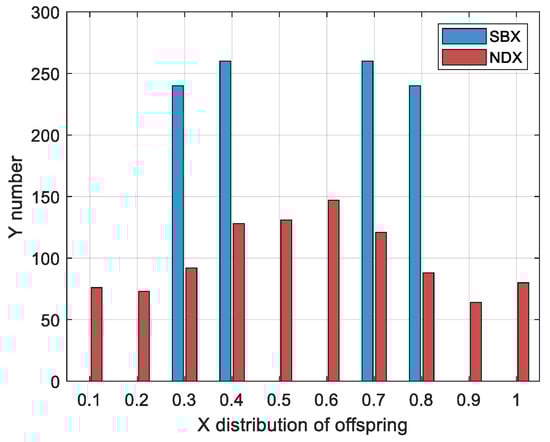 To illustrate the superiority of the NDX operator, two parent individuals (0.3 and 0.7) were selected, and both NDX and the traditional SBX operator were applied to generate 1000 offspring within the [0,1] interval. The offspring distributions were depicted in Figure 7, revealing that offspring generated with the SBX operator clustered around the intervals [0.2–0.4] and [0.6–0.8], which are close to the parent individuals, while those produced with the NDX operator were more evenly distributed across the entire range. This indicates that the NDX operator possesses a broader search space and significantly outperforms the traditional SBX operator.