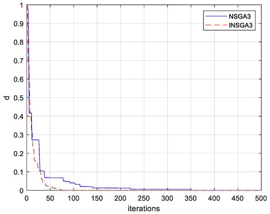 To demonstrate the effect of the cosine-like mutation distribution index NSGA-III, a proximity parameter calculated by Equation (19) was defined. The DTLZ1 function was again applied to compare the convergence speeds of the two algorithms. The proximity parameter reflects the closeness of each iteration’s result to the true optimal solution; smaller values indicate greater proximity, suggesting higher optimization efficiency and accuracy. As shown in Figure 8, both algorithms reached global optimal positions by the end of the iterations. However, with the variable mutation distribution index, the improved algorithm converged by the 260th generation, while the traditional algorithm required 360 generations to converge, demonstrating a 100-generation acceleration in convergence speed without sacrificing accuracy.