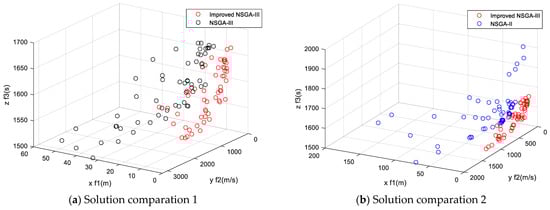 Solution comparations for three algorithms. (a) Improved NSGA-III and NSGA-III. (b) Improved NSGA-III and NSGA-II.