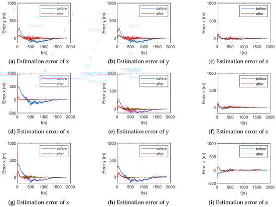 Position error of estimation in satellite 1, 2, 3. (a–c) Position error of x, y, z axis in satellite 1. (d–f) Position error of x, y, z axis in satellite 2. (g–i) Position error of x, y, z axis in satellite 3.