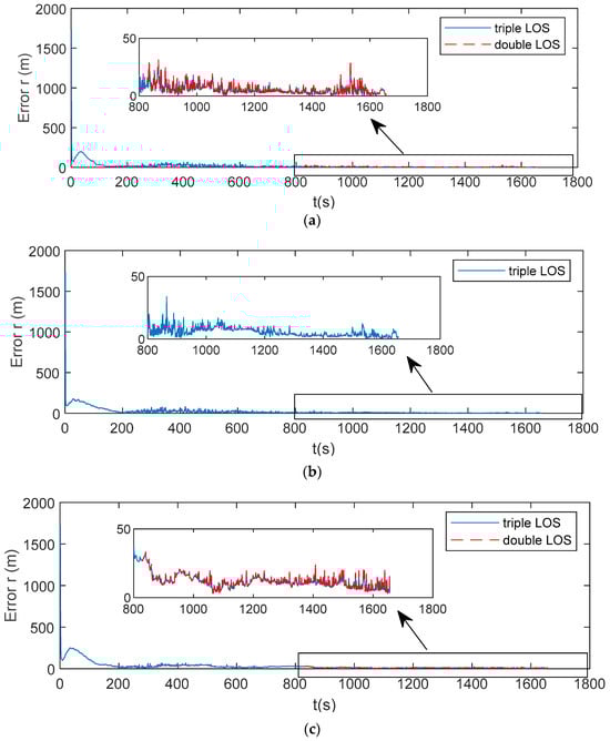 The variation in observability during the rendezvous process for double-LOS and triple-LOS collaborative positioning systems was compared, as shown in Figure 2a. The observation level is represented by the reciprocal of the condition number of the observability matrix mentioned in Equation (11). The value reveals that triple-LOS positioning significantly outperforms dual LOS throughout the entire rendezvous process. Figure 2b shows the change in the distance between the tracking satellites and the target in this rendezvous process; at about 1820 s, tracking satellites 1 and 2 intercepted the target. Figure 2c demonstrates that, as the rendezvous progressed, the angle formed between the two chasers and the target came closer to 180 degrees, which means that double LOS deteriorated into single LOS and therefore caused the observability degree to gradually decrease. When the LOS of the two chasers almost recombined into single LOS, the observation degree dropped to the lowest level. At the interception point, as satellite 3 became too distant from the target, the observability level was mainly determined by the nearby satellites 1 and 2; therefore, the observability of triple-LOS and double-LOS systems tends to be consistent. Nevertheless, observability remained at a high level, indicating that the system maintained high observability throughout the whole process.