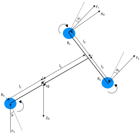 The vehicle under consideration is a hybrid of fixed-wing and rotary-wing UAVs. It comprises three rotors such that the placement of rotors at the end of each arm of the tilt-rotor tricopter forms a T-shaped structure, as shown in Figure 1. The three rotors can be tilted from 0° to 90° to realize the transition between hover and fixed-wing modes. These three rotors are labeled as , and , where , , and are the tilt angles of , , and , respectively. , and show the forces acting on each rotor, whereas , , and represent the moment arms.