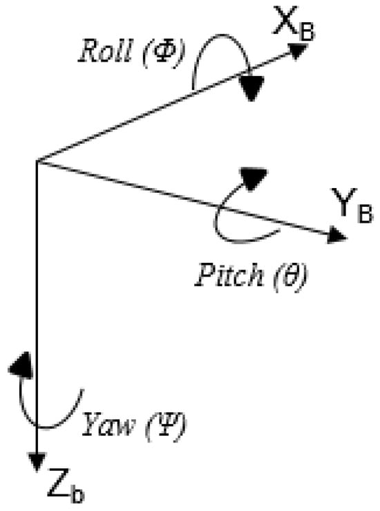 The coordinate system can be seen in Figure 2. The axis is defined as the direction directly ahead, as seen from the tricopter’s perspective, and the axis as the direction to the right. The axis is established directly downward from the tricopter’s center of gravity. Using the rotation matrix R(), the relationship between the coordinate systems of the earth and the tricopter (Body) may be mathematically explained. The attitude/rotation is defined by Euler angles, roll angle (), pitch angle (), and yaw angle (), and is the angle around , , and axes, respectively. A Direction Cosine Matrix (DCM) is used for their transformation from inertial (navigation) frame (X,Y,Z) to body frame (), which is defined in Equation (1):