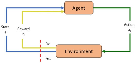 The basic framework of reinforcement-learning algorithms consists of an agent that takes actions according to its state space in a particular environment and receives feedback to perform the defined task. Over time, the continuous agent–environment interaction leads to a maximized reward [7]. The agent, in its initial state, , in the environment, acts, , and, in return, receives a reward, , to decide its following action to acquire the next state, . This iterative approach follows a continually updating policy function to estimate its next move. This can be seen in Figure 3.