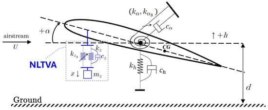 The objective of this study is to numerically assess how an NLTVA can improve aeroelastic performance under ground effect conditions, addressing both the critical flutter speed and the resulting post-flutter behavior. The problem is analyzed using a typical section model supported elastically by nonlinear springs, which provides a practical approximation of a high-aspect-ratio wing and is widely used in flutter calculations [26,35,36]. The aeroelastic equations of motion are formulated using Lagrange’s equations. Aerodynamic loads are computed using the UDVM, while the ground effect is simulated using the mirror-image method. The transient aeroelastic behavior at, before, and after flutter onset is obtained by numerical time integration. The influence of key design parameters, including the linear stiffness and damping of the NLTVA and the airfoil’s height from the ground, on flutter dynamics is analyzed. Additionally, the effect of the NLTVA’s nonlinear component on LCO amplitude and bifurcation behavior is investigated. The modeling and numerical solution procedures are presented in Section 2, with results and analysis in Section 3.