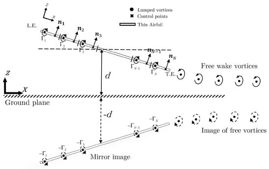The aerodynamics of the airfoil in proximity to the ground are modeled using the UDVM, with the ground interference effect simulated using the mirror image method [37]. UDVM is a computational approach based on potential flow theory. It is inherently nonlinear, applies to two-dimensional thin bodies in a uniform flow , and accounts for flow interference. However, it does not incorporate flow separation or thickness effects. Figure 2 illustrates the discrete vortex representation of the airfoil, its wake, and their mirror images. Here, the airfoil is discretized into N panels, in which each panel is represented by a lumped vortex strength (noted ) placed at the quarter chord of the panel. The mirror image method simulates the ground effect by considering the mirror image of the primary model, positioned symmetrically relative to the ground plane. Thus, the influence of the ground is modeled by the image vortices, which have the same strength but are opposite in direction to those of the primary model. The image vortices are located at a distance of from the primary model, where d is the height of the structure above the ground. The numerical solution proceeds in a time-marching process formulated by satisfying the continuity equation complemented with boundary conditions. The aerodynamic model applied in this study is well established; for a comprehensive mathematical foundation, readers are encouraged to consult Katz and Plotkin’s textbook [37]. The main constitutive equations are recalled next.