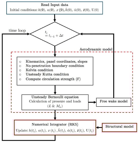 Equation (7) is solved iteratively in the time domain using a fifth-order Runge–Kutta numerical integrator to obtain the dynamic response of the system. This response is examined to identify the nature of aeroelastic instabilities. Particularly, flutter instability is determined at a speed where the response becomes neutral. Below this speed, the response decays, while above it, the response grows and may develop to an LCO. During the numerical integration, the integrator calculates the airfoil’s position, which is then provided to the aerodynamic model. In return, the aerodynamic model computes the aerodynamic loads and feeds them back to the integrator. To maintain stability and prevent the response from diverging, an integral time step is employed within the integrator, during which the aerodynamic load is assumed to remain unchanged. Figure 3 illustrates the flowchart for performing the time-domain aeroelastic analysis using the UDVM.