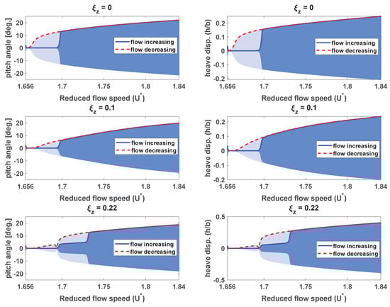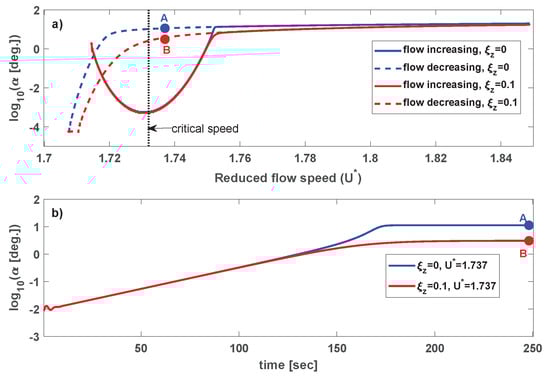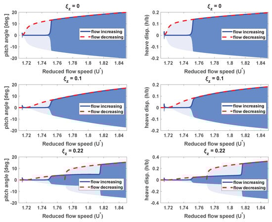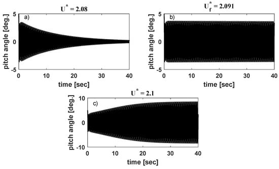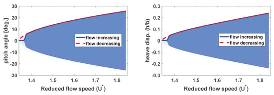 The post-flutter solution follows the process outlined in Figure 3. The coefficient of nonlinear restoring force for pitch is set to unity. In the numerical time integration simulation, the airfoil motion is initiated with an initial disturbance of pitch angle, while all other degrees of freedom are set to zero. The flow speed is initially set below the critical speed and is then gradually increased and decreased back to the initial value within a single computation. The resulting post-flutter responses, for both increasing and decreasing flow speed, are examined to determine the system’s criticality that describes the nature of the Hopf bifurcation related to flutter. The Hopf bifurcations of a supercritical nature are characterized by the gradual change in the onset of LCOs, whereas subcritical ones are characterized by jump phenomenon and the appearance of a bistable region; see [26], for instance.