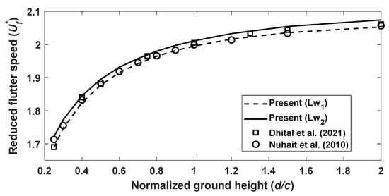 As the airfoil moves closer to the ground, a significant change occurs in the wake dynamics, resulting in increased aerodynamic loads. Consequently, the closer the airfoil is to the ground, the stronger the ground effect becomes, destabilizing the airfoil at lower speeds. This is illustrated in Figure 5, showing a significant decrease in the flutter speed as the airfoil height above the ground is decreased. In the figure, relates to the case where the most recent wake vortex is placed at the trailing edge whereas it is placed at behind the trailing edge for . The latter case shows a slight increase in flutter speed. Nevertheless, all results are in good agreement with the references [5,6]. Similar results could be obtained using CFD, albeit with significantly higher computational cost compared to the present method, assuming that the flow is governed by potential theory.