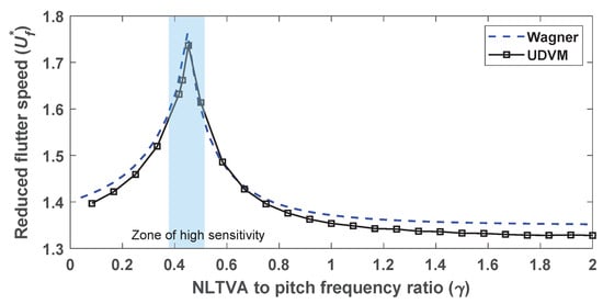 Effect of NLTVA–pitch frequency ratio on the reduced flutter speed (and with ) for two different aerodynamic models.