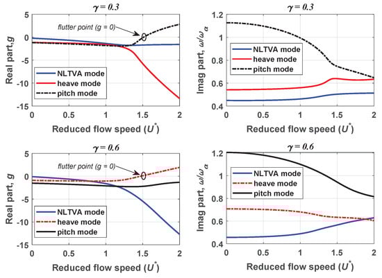 Complex eigenvalues analysis of Wagner-based results on an airfoil equipped with an NLTVA, for increasing flow speed, for and , and with . The flutter speed corresponds to the point where one of the modes’ real part becomes positive (noted on the graphs).
