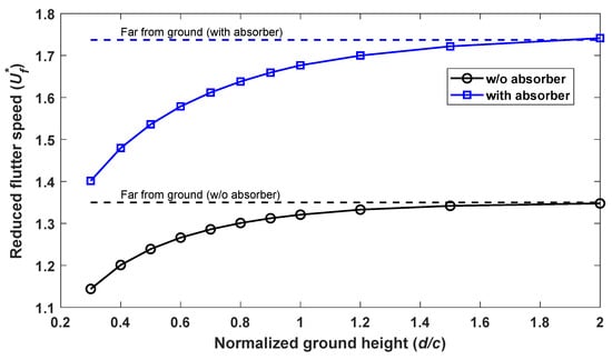 Effect of ground height (normalized by the airfoil chord) on the reduced flutter speed of an airfoil with and without an absorber. The dashed lines correspond to the result without the ground effect .