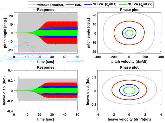 Figure 14 retrieves time histories and phase plots of the system near the ground at the reduced speed of and presents comparisons between various cases: without the absorber, with a TMD, and with a NLTVA configured at or at . The reduced speed chosen voluntarily exceeds the critical speed for all systems. Simulations are initiated with a small disturbance of pitch angle ( deg.) and are allowed to have prolonged transients for the system to develop LCOs. The phase in Figure 14 is plotted for part of the transient response after the response has reached a steady state. Due to the ground influence, the equilibrium position of the responses is no longer symmetric but has shifted upward. Among the cases, the system without an absorber attains LCO most quickly and exhibits the largest amplitude. In contrast, the systems with the absorber exhibit significantly reduced LCO amplitudes, as the absorber particularly affects the pitch, which is considered as most energetic degree of freedom of the system. Furthermore, the mitigation of LCO is especially effective when the NLTVA is employed.