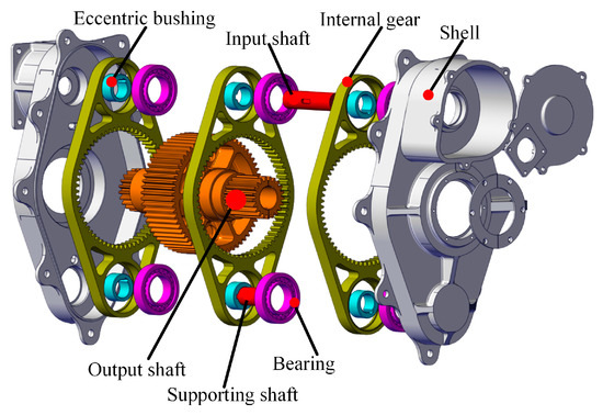 In this paper, the three-dimensional assembly model of the aerospace three-ring reducer is shown in Figure 1. The aerospace three-ring reducer three-dimensional assembly model exploded drawing is depicted in Figure 2. It features the following three parallel axes: the output shaft, input shaft, and support shaft. Each of these shafts is equipped with a deep groove ball bearing at both ends in the support shaft section. Additionally, the internal gear is linked to the input shaft and support shaft via the planetary bearings. The meshing of the internal and external gears is a typical few teeth difference meshing, completing the power output.