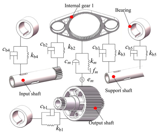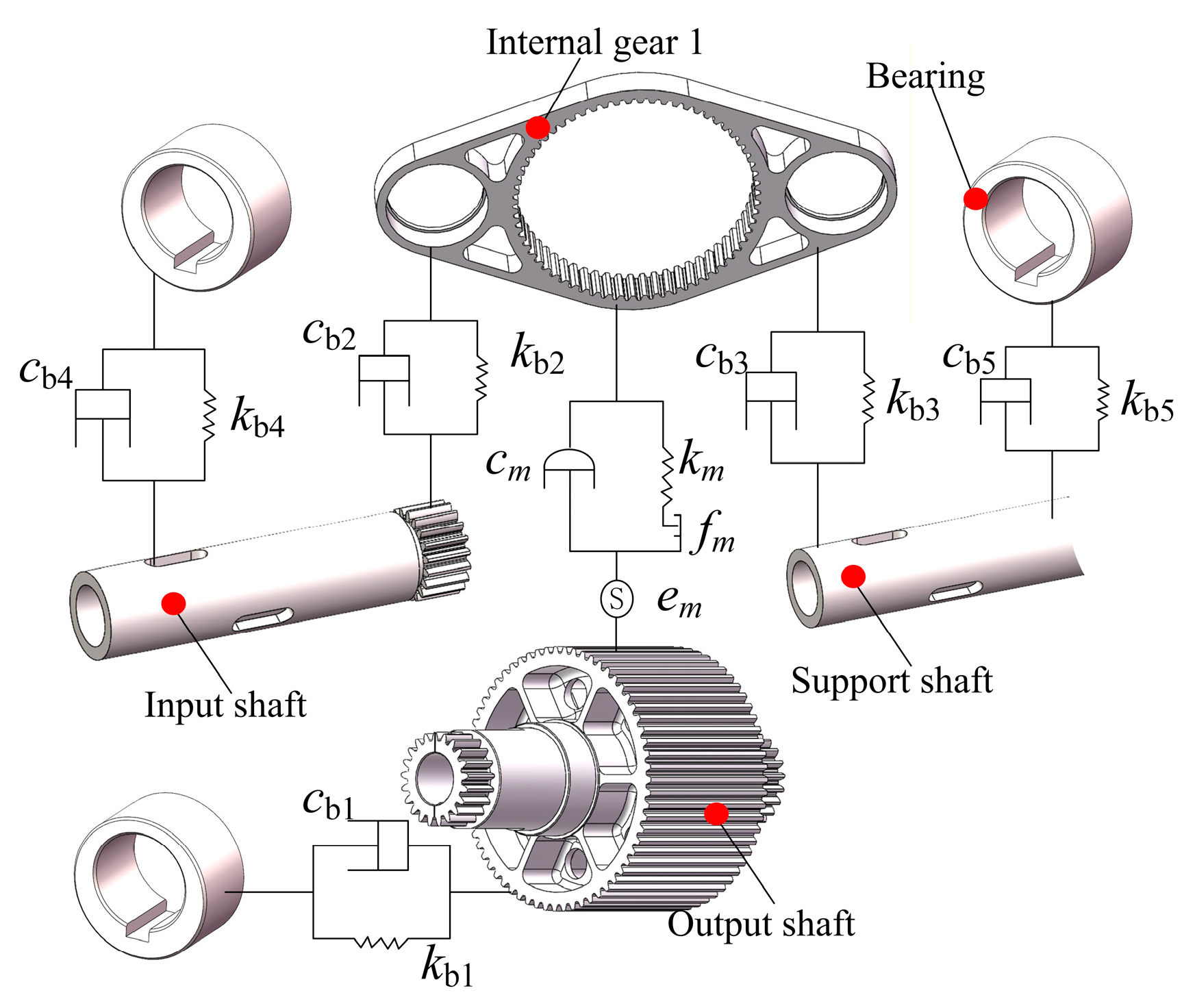 In Figure 3, km, cm, and fm are the nonlinear force displacement functions composed of the meshing stiffness, meshing damping, and backlash between the internal and external gears, respectively; kb1 and cb1 represent the support shafts.