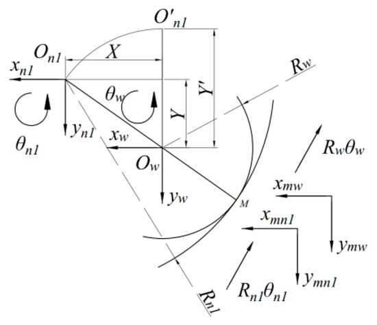 The relative displacement of the vibration at the meshing point M is . Considering the normal component of the displacement in each direction at the meshing point, it can be considered that the normal component of the relative displacement of the vibration between the internal gear plate n1 and the external gear w at the meshing point M is as follows: