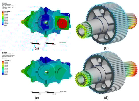 Zhang used ANSYS Workbench software to conduct modal analysis on the three-dimensional virtual prototype of the NN-type small tooth difference involute planetary gear reducer and completed the optimized design of the reducer [15]. Huang Chao et al. used the dynamic contact finite element method to obtain the internal dynamic excitation of the gear teeth meshing, calculated the intrinsic frequency of the planetary gear mechanism according to the established dynamic finite element modal, and studied its structural dynamic response and acceleration noise [16] by applying the Lanczos method to obtain the intrinsic frequency and the corresponding vibration modes of the gear reducer. The modal data were analyzed using the PolyMAX modal identification method to obtain the modal frequencies and damping ratios, and the experimental modal parameters were verified according to the Modal Assurance Criterion (MAC) [17]. Hu et al. [18] analyzed the effect of dislocation coefficients and helix angles on the transient meshing performance in a finite element model of a gear pair based on the explicit dynamic module embedded in commercial finite element analysis software. Wang et al. [19] used the ANSYS/LS-DYNA analysis module to establish a dynamic contact and tooth impact model considering tooth friction, tooth side clearance, and other factors to simulate the vibration response of the transmission system under real working conditions. Tristan M E et al. [20] used a finite element model to obtain the intrinsic frequency and vibration pattern of the gear pair, and compared the calculated results with the theoretical model of the dynamics constructed by the concentrated parameter method as well as the experiments for verification.