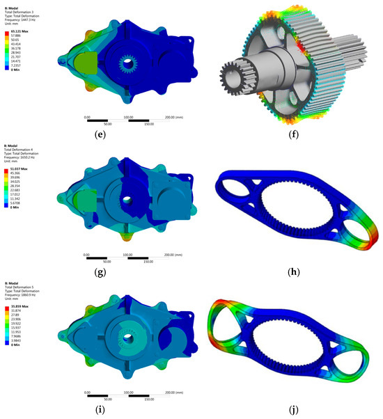 The first–fifth-order modal shapes of the aerospace three-ring reducer. (a) The first-order modal shape of the shell. (b) The first-order modal shape of the external gear. (c) The second-order modal shape of the shell. (d) The second-order modal shape of the external gear. (e) The third-order modal shape of the shell. (f) The third-order modal shape of the external gear. (g) The fourth-order modal shape of the shell. (h) The second-order modal shape of the internal gear. (i) The fifth-order modal shape of the shell. (j) The third-order modal shape of the internal gear.