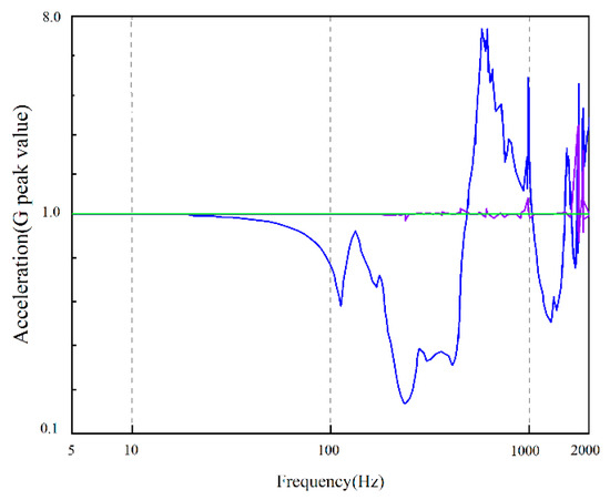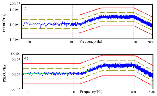 After applying the vibration drive signal to the aerospace three-ring reducer, as illustrated in Figure 9, the acceleration power spectral density curves of the vibration response obtained under the two operating conditions are presented in Figure 10.