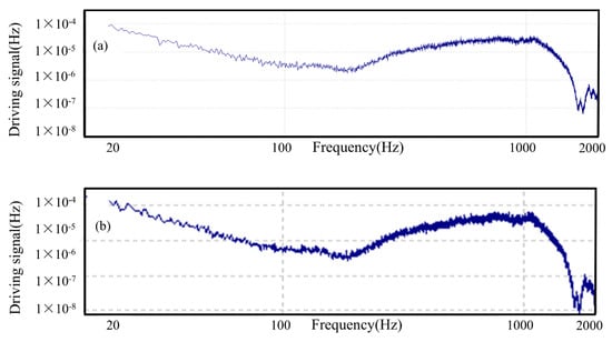 Power spectral density curve of driving signal. (a) No-load condition drive signal. (b) Load condition drive signal.