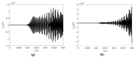 Vibration displacement response of transmission system. (a) Vibration displacement response of the external gear w in the x-direction. (b) Vibration displacement response of the external gear w in the y-direction. (c) Vibration displacement response of the internal gear plate n1 in the x-direction. (d) Vibration displacement response of the internal gear plate n1 in the y-direction. (e) Vibration displacement response of the internal gear plate n2 in the x-direction. (f) Vibration displacement response of the internal gear plate n2 in the y-direction. (g) Vibration displacement response of the internal gear plate n3 in the x-direction. (h) Vibration displacement response of the internal gear plate n3 in the y-direction.