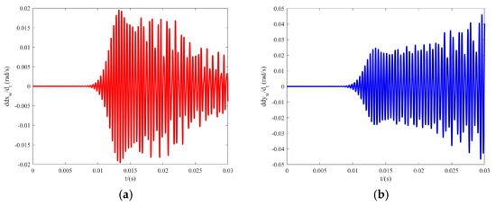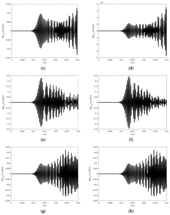 Taking Figure 12a as an example, before 0.007 s, the amplitude of the vibration angular velocity is essentially zero, and then it gradually increases. At 0.014 s, the amplitude of the vibration angular velocity reaches its maximum value, after which it decreases and stabilizes. The angular velocity amplitude of the gear torsional vibration is minimal, while the output gear torsional vibration displacement is the largest, with a maximum value approaching 0.25 m/s2. The time taken for the gear torsional vibration angular velocity to reach a steady state is shorter than that for the other direction, indicating that the torsional vibration angular velocity is smoother than the vibration displacement. Consistent with the results of the vibration displacement response analysis, it is evident that the amplitude of the vibration velocity in each direction of the output outer gear is relatively small, further demonstrating the superiority of the structural design of the aerospace three-ring reducer, which effectively suppresses the vibration of the output shaft.