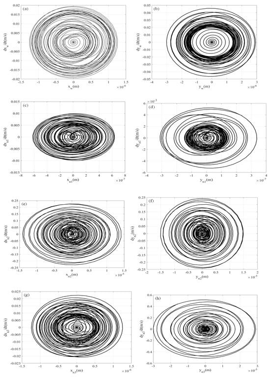 Vibrational displacement–velocity phase diagram. (a) Displacement–velocity phase diagram of the external gear w in the x-direction. (b) Displacement–velocity phase diagram of the external gear w in the y-direction. (c) Displacement–velocity phase diagram of the internal gear n1 in the x-direction. (d) Displacement–velocity phase diagram of the internal gear n1 in the y-direction. (e) Displacement–velocity phase diagram of the internal gear n2 in the x-direction. (f) Displacement–velocity phase diagram of the internal gear n2 in the y-direction. (g) Displacement–velocity phase diagram of the internal gear n3 in the x-direction. (h) Displacement–velocity phase diagram of the internal gear n3 in the y-direction.