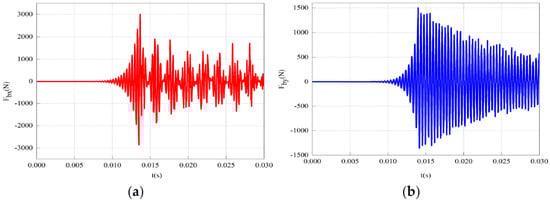 Based on the gear vibration displacement–angular velocity response, illustrated in Figure 11 and Figure 12, the dynamic load of the bearings can be determined by substituting the results into Equation (10). This is depicted in Figure 14, which presents the dynamic loads of the internal gear plate, corresponding to the left and right bearings in the x- and y-directions, respectively.