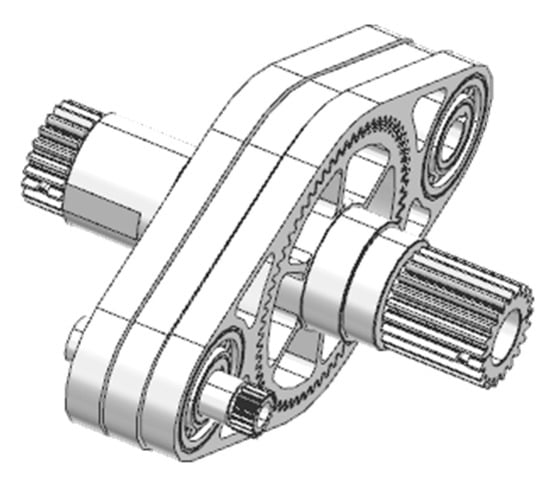 - Zhang, H. Design of New Type Involute Planetary Gear Reducer of Small Tooth Number Difference. Adv. Mater. Res. 2012, 490, 2076–2080. [Google Scholar] [CrossRef]