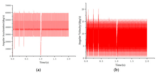 Output gear shaft angular acceleration and angular velocity simulation results. (a) Angular acceleration curve. (b) Angular velocity curve.