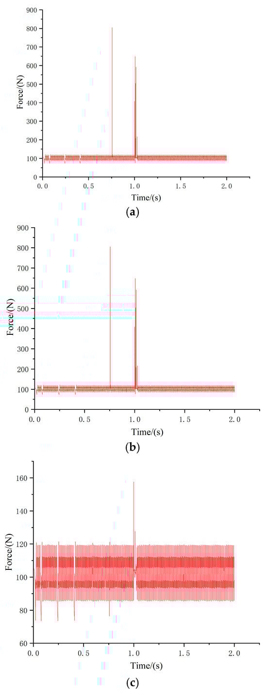 Simulation results of the meshing force between the output gear shaft and internal gear. (a) Internal gear 1. (b) Internal gear 2. (c) Internal gear 3.