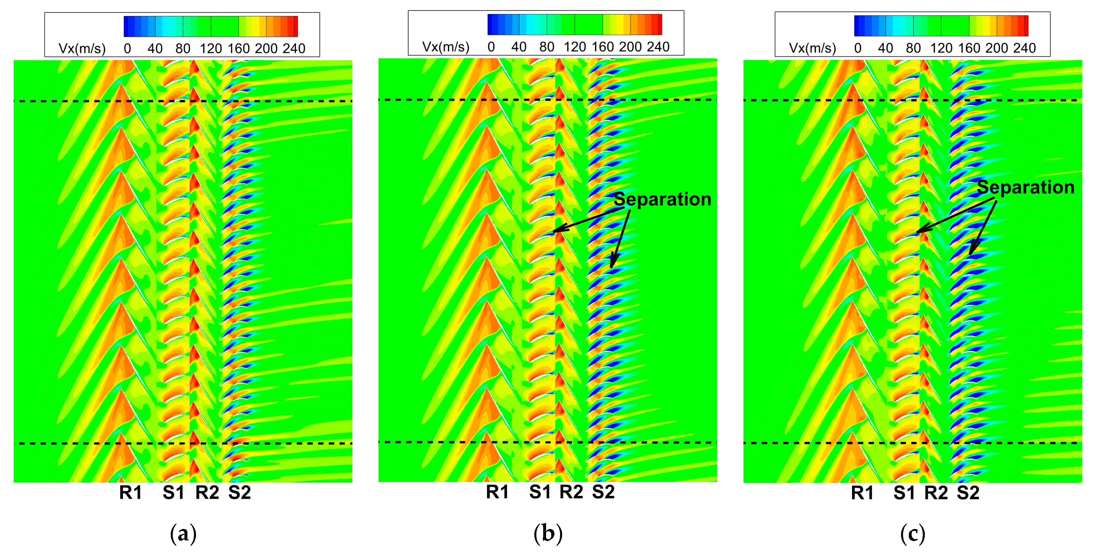 Figure 39. Axial velocity at 90% span: (a) time-averaged result of the URANS simulation; (b) time-averaged result of the Filtering simulation; and (c) Harmonics 5 simulation. (The dashed lines represent the boundaries of the distorted region).