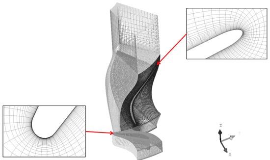 The meshing of this paper uses ANSYS-TurboGrid 2021 software of ANSYS Corporation. A grid independence study was critical to ensure that the number of grids used did not influence the calculation results. The turbine model employed a single flow channel alongside a structured grid to optimize computing resources. The grid configuration is illustrated in Figure 3, with mesh refinement applied to the wall surface, leading edge, and trailing edge.