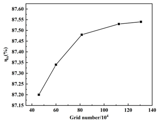 The grid independence study focused on total static efficiency. Several simulations were conducted by varying the number of grids, specifically using 457,810; 599,917; 814,709; 1,123,048; and 1,306,634. Any change in efficiency greater than 0.1% was considered significant for turbine machinery. The observed total static efficiencies were 87.2%, 87.34%, 87.48%, 87.53%, and 87.58%, as shown in Figure 4. It was noted that when the number of grids was fewer than 1,123,048, the total static efficiency exhibited substantial variation, indicating a significant impact on the calculation results. Conversely, when the number of grids exceeded 1,123,048, the rate of change in total static efficiency dropped below 0.05%. Consequently, the chosen number of grids was set at 1,123,048 to ensure accuracy.