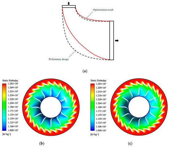 Optimization comparison of meridian planes and static enthalpy comparison on span 0.5: (a) optimization comparison of meridian planes; (b) static enthalpy comparison of preliminary design; (c) static enthalpy comparison of optimization result.