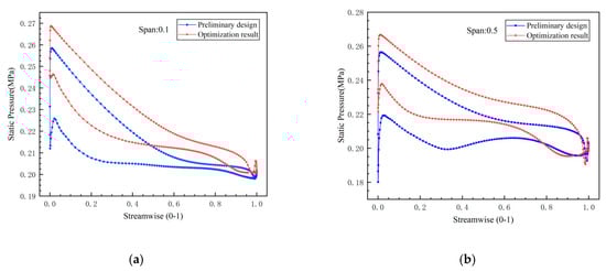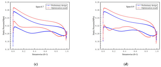 The static pressure curves of the suction surface and pressure surface on different spans: (a) span of 0.1; (b) span of 0.5; (c) span of 0.7; (d) span of 0.9.