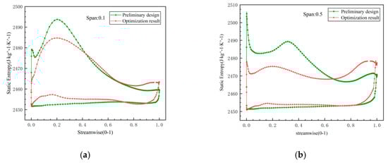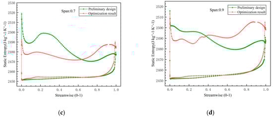 The static entropy curves of the suction surface and pressure surface on different spans: (a) span of 0.1; (b) span of 0.5; (c) span of 0.7; (d) span of 0.9.
