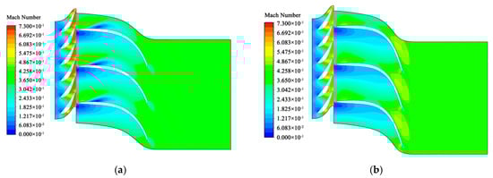 Figure 8 illustrates the Mach number at spans of 0.7 and 0.9 for both the preliminary design and the optimized blade. Evidently, the preliminary design exhibited areas of low velocity on both spans of the suction surface, with some regions reaching a speed of 0 m/s. These low-speed areas were attributed to small vortices of varying degrees. The flow separation on the suction surface of the preliminary design led to the formation of a larger-scale vortex. As this vortex increased in size, it compressed the fluid within the flow path, causing acceleration and a subsequent reduction in pressure on the suction surface, creating a detrimental feedback loop. The low pressure at the impeller’s inlet also resulted in a higher Mach number at the outlet of the stationary blade. The vortex’s continual growth affected the subsequent blade’s pressure surface. The figure shows that the velocity in the vortex regions was particularly low, leading to a blockage in the flow channel and increasing the mass flow for the same pressure ratio. In contrast, the optimized blade demonstrated a smaller area of low Mach number, primarily concentrated at a span of 0.9. This improvement was due to the optimized impeller blade having a smaller outlet area, which allowed for further fluid acceleration at the outlet, resulting in a higher Mach number.